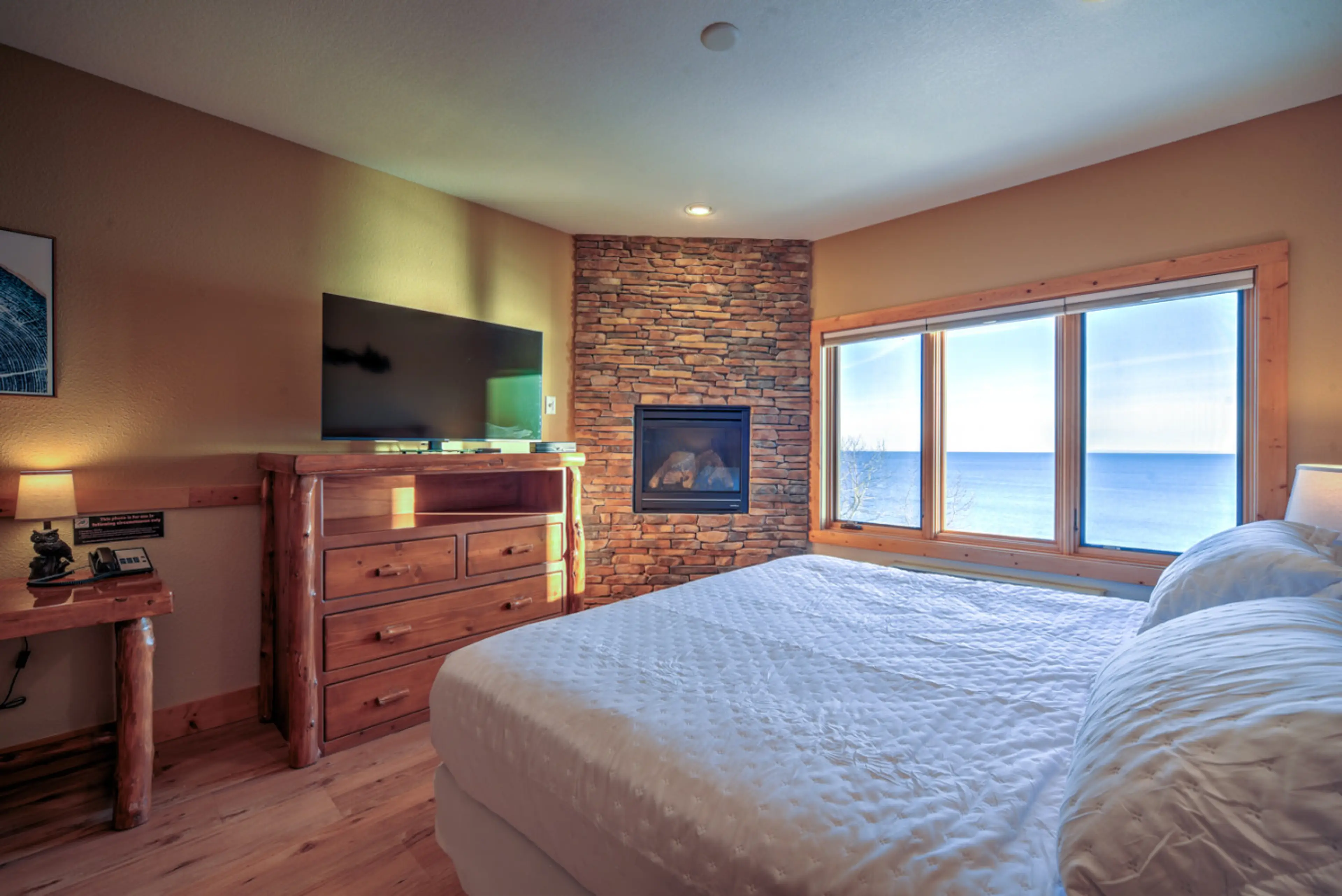 Settle into a modern king studio that feels like a boutique hotel—only better. A handy kitchenette (mini-fridge, microwave, coffee maker) makes quick meals easy, and the cozy fireplace and jetted tub make evenings extra relaxing. No balcony, but you’re steps from Lake Superior in this waterfront uni...